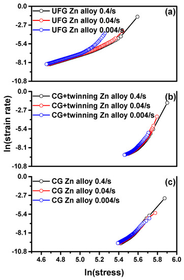 Where and are the creep strain rate and creep stress, respectively. is the contact area, is the contact depth, , , and were measured by the area function calibration procedure and is a constant for Berkovich indenter and is the stiffness [20]. The dates of S-h curves in the holding regime can be measured in advance by the CSM mode and the corresponding details can be seen in the ref. [13]. Figure 7a–c gives the curves of UFG/CG+twinning/CG Zn alloy and the stress exponent (n) value of the final steady-state creep can be deduced by the equation of . Table 1 summarizes the n of these three materials obtained at three different regions. Clearly, the value of n is apparently smallest, medium and largest in the UFG/CG+twinning/CG Zn alloy, respectively. At of 0.004/s to 0.4/s, n in the UFG Zn alloy are 3.71, 3.93 and 4.03, which are apparently smaller than the values in the 5.08, 6.66 and 7.15 in the CG+twinning Zn alloy and 8.66, 10.97 and 12.88 in the CG Zn alloy.