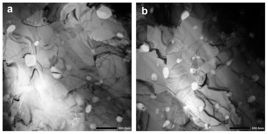 Due to the lower melting point and stacking fault energy of Zn alloys, the high density of defects such as point defects, dislocations, GBs and their reaction products provides a high driving force for dynamic recovery, which tends to promote subsequent recrystallization [12]. Additionally, dislocations in the Zn need to travel a very short distance of the order of 1 μm and would be lost at nearby GBs during unloading [23]. Therefore, it can be expected that the traditional TEM observation hardly capture available deformed structure information. Figure 9a,b give two typical bright-field images of top layer after SFT treated and it can be seen that their grain is extremely clear. Nevertheless, some studies have found that the presence of second-phase in the Zn–Al alloy can provide effective barriers to the movement of dislocation [23]. To date, there are two principles of models for dislocation sliding in the superplasticity (Figure 10). One is the model that dislocations move along the GB (Figure 10a) and the other is the dislocations are produced and move inside the grain (Figure 10b). For example, T.G. Langdon et al. provide one principle of the GB sliding in the superplastic materials: dislocations move along the GB and pileup at the triple junction and then climb into the adjacent GB following the previous steps [24]. Even so, some authors have described that dislocation sweep across the grain interior and then climb along the GB [23,25]. Apparently, such a contradiction between these two views needs more understanding.