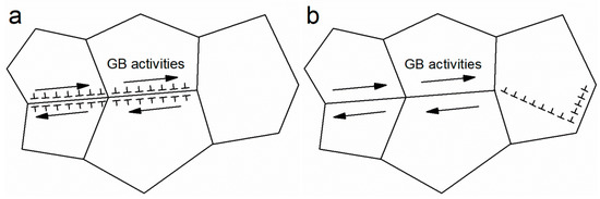 Principles of two models for dislocation sliding in superplasticity: (a) Dislocations move along the grain boundary; (b) dislocations are produced and move in the blocking grain. Arrows in the graphs presents the grain boundaries (GBs) actives.