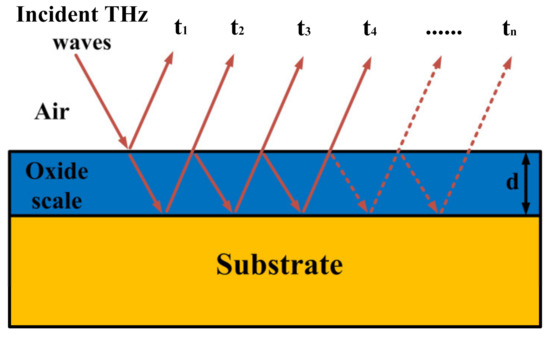 Schematic diagram of multiple reflections of terahertz waves between the oxide scale and the substrate.