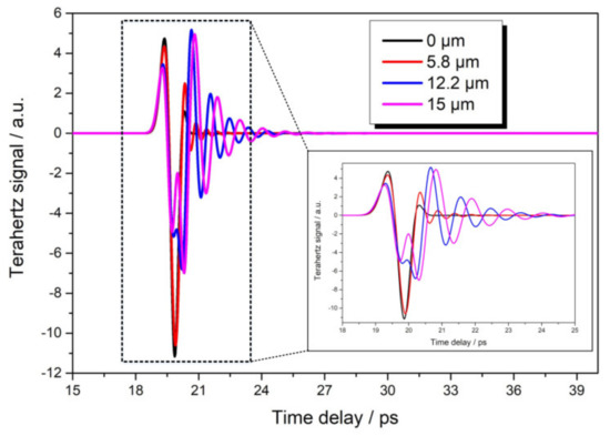 Terahertz finite difference of time domain (FDTD) simulated signals from four different samples (0, 5.8, 12.2, and 15 μm).