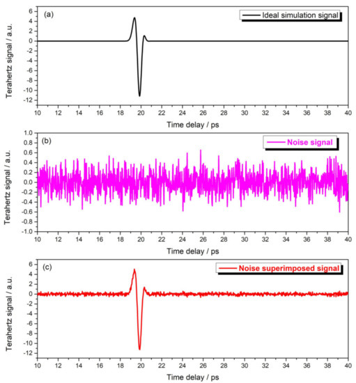 The process of adding Gaussian white noise to the terahertz simulation signal (taking the signal with thickness 0 μm as an example): (a) ideal simulation signal; (b) noise signal; (c) noise superimposed signal.