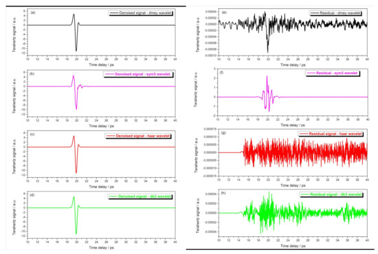 In this work, four wavelet denoising methods were used to reduce noise: dmey global default threshold for denoising, sym3 wavelet heuristic Stein’S Unbiased Risk Estimation (SURE) threshold denoising, haar wavelet soft SURE threshold denoising, and db3 wavelet fixed threshold denoising (all decomposition levels were set to 5) [64,65]. The sample signal with thickness of 0 was still taken as an example, the residual analysis was performed using the denoised signal and the original unnoisy signal, and the variation of the residual was used to determine which type of noise reduction method was the appropriate noise reduction method, that is, the noise reduction method adopted in this study.
