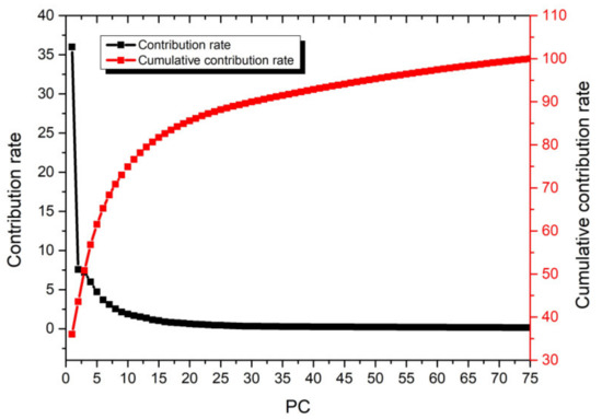 The terahertz time domain data dimension of 76 samples obtained by the FDTD simulation was 76 × 3747. If this large amount of data is directly used for modeling, the calculation speed would be reduced and the accuracy of regression prediction would also be reduced. PCA was used to reduce the dimensions of terahertz time domain data. The eigenvalues of the top three eigenvectors extracted from the terahertz time domain data were 1153.10, 242.91, and 231.47, respectively; as shown in Figure 5, the contribution rates of the top three eigenvectors extracted from the terahertz time domain data were 36.00%, 7.58%, and 7.23%, respectively; the cumulative contribution rate of the first three principal components had exceeded 50%, but the principal component score after the first three principal components was getting lower and lower. Here, in order to make the contribution rate reached 100%, it was found that the cumulative contribution rate of the first 75 principal components was 100%. Finally, the data dimension was reduced from 76 × 3747 to 76 × 75, combined with the eigenvalues and contribution rates above, according to the seventy six-dimensional scores of the top 76 PCs, the top 76 PCs of terahertz time domain data were used as the input to PSO-ELM models for the oxide scale thickness prediction.