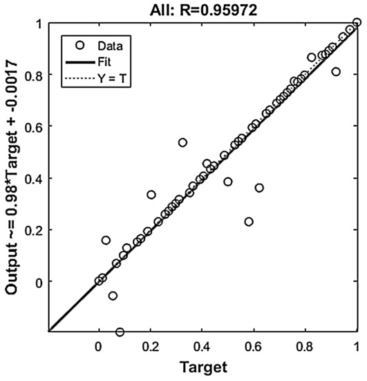 For the training results of BP model, to check the reliability and accuracy of the BP model, as shown in Figure 6, it shows comparative results that the training results of the BP model’s target (T, actual value of oxide scale thickness) compared to the BP model’s output (Y, predicted value oxide scale thickness). The linear fitting function curve Y = T in the Figure 6 represents the ideal situation that the predicted value must exactly match the actual value. It can be clearly seen that all the predicted data and actual data are scattered around the Y = T line, their actual linear fitting function curve is Y = 0.98·T−0.0017, and a trained BP model with the comprehensive R-value of over 0.95 was obtained, all these above proved that the trained BP model had good regression prediction ability.