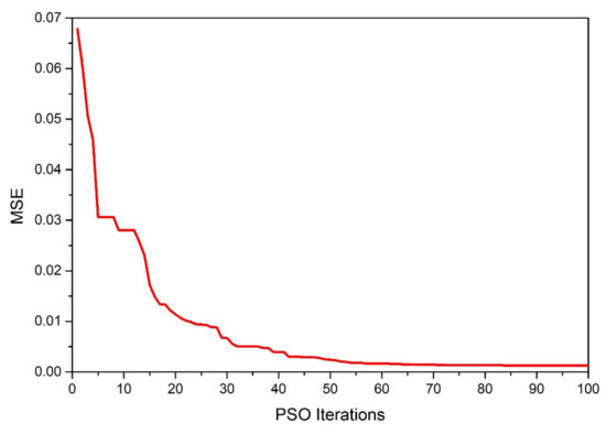 For the training results of PCA-PSO-ELM model, to check the reliability and accuracy of the PCA-PSO-ELM model, the MSE was chosen as the fitness function, hence, low value of MSE was pursued during the optimization process and the lower the better, as shown in Figure 7, from the relationship between the PSO iterations and MSE, as the PSO iterations increased, the MSE decreased; the MSE was nearly constant while the PSO iteration was more than 70, a trained PCA-PSO-ELM model with the R-value of 1 was obtained, all these above proved that the trained PCA-PSO-ELM model had excellent regression prediction ability.