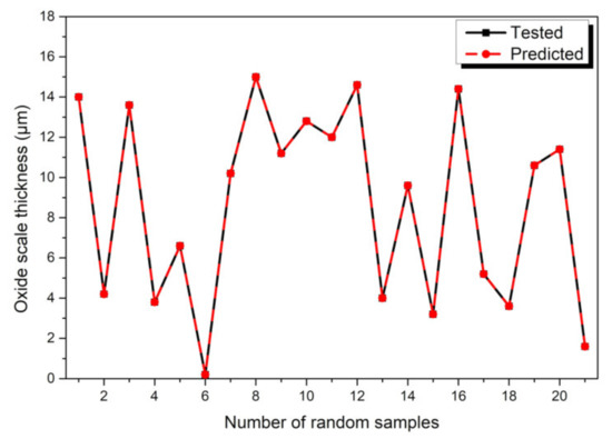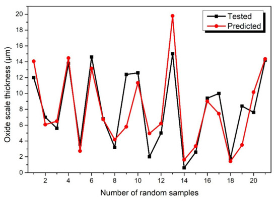 To compare the oxide scale thickness prediction performance of BP model and PCA-PSO-ELM model. As shown in Figure 8, the comparisons between the testing data and the prediction results obtained by BP model were provided, where the black and red symbols stand for the tested data and predicted results of the oxide scale thickness of 21 random samples, respectively, it showed that the changes between the tested data and the prediction result was basically the same trend. Some tested data points corresponded to good prediction results, overall, there was still a large fluctuation between the prediction results and the test data.