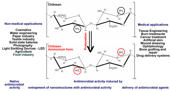 Chitosan is a promising biopolymer with increasing applicability in many applications, especially in medicine but also in food packaging. This high interest for chitosan is given by several characteristics such as biocompatibility and no toxicity; abundant and natural origin, being a derivative of chitin, a polysaccharide backbone with a polycationic structure (Figure 1); the ammonium groups being responsible for the antimicrobial activity of the polymer; high water adsorbing capacity; biodegradability; etc. Due to these properties, chitosan is used in many medical and non-medical applications, as presented in Figure 1. In food industries, chitosan is used because of its native antimicrobial activity which makes it suitable for the developing food packaging materials to be able to extend the shelf life of both vegetables and fruits, as well as meats and many other food up to tens of days [19,21,22,23,24,25,26,27,28,29,30,31].