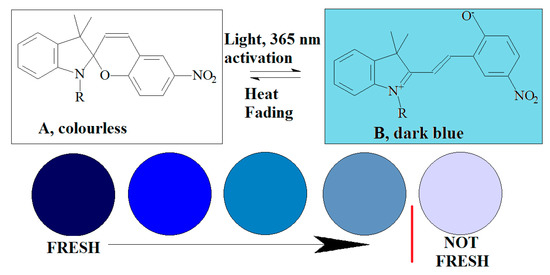 Another example of TTI based on activation with UV light comes from BASF in the form of the OnVuTM label (Figure 3). The indicator is a colorless organic molecule which by irradiation for a few seconds with UV light changes its structure into an excited state, becoming dark blue. As long as the temperature is kept under −18 °C the excited form of the molecule is stable. Increasing the temperature will promote its return to the colorless ground state [142]. A small increase in temperature over a short period of time will only induce a slight fade of color while increasing the time or a big change in temperature will speed up the discoloration process.