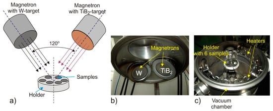 The tested coatings were deposited on to samples made of high-speed steels SW7M with a diameter of 25 mm, thickness 6 mm and surface roughness Ra ≤ 0.05 μm and on samples of monocrystalline Si (100). The samples were washed with 99.9% pure alcohol before being placed in the process chamber. Before the coating process, the samples were ion-etched in the Ar + plasma. During the coating process, the sample temperature was stabilized at 300 °C using resistance heaters. The Ti-B-W coatings were deposited by changes of the source power in the range 25–75 W. The deposition time for each coating was 1 h. The scheme and view of the magnetron system that we used are shown in Figure 1a–c.