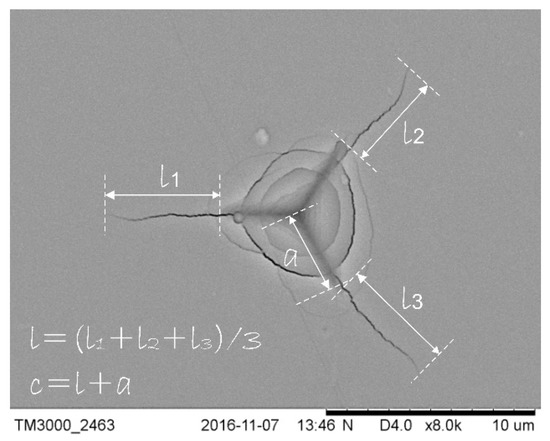 where: KIC—fracture toughness; xv–indenter geometry factor (for Laugier Equation xv = 0.016); E—Young modulus of coating (GPa); H—hardness of coating (GPa); P–the indentation load (mN); a—the length from the center of the indent to the corner of the indent (μm); l1,2,3—the length of the cracks; l = (l1 + l2 + l3)/3; c = l + a—the total length from the center of the indent to the end of crack.
