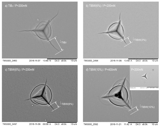 For measured the sizes of the crack lengths emerging from their corners after indentation with different forces 50, 100, 200, 300 and 400 mN, all the generated cracks were imaged using a scanning electron microscopy (SEM-Hitachi TM3000). The images of indentations for different types of coatings are shown in Figure 4. Observations for the indentations made with the different loads showed, that the cracks for coatings such as TiB2, Ti-B-W (3%), Ti-B-W (6%), which were generated in the corners of the indentation, were clearly visible and well measurable already at the indenter load of 200 mN (Figure 4a–c). On the other hand, the cracks for coating Ti-B-W (10%) were visible and well measurable only with indenter load of 400 mN (Figure 4d). Such intender loading values were accepted for testing of the fracture toughness KIC for selected coatings.