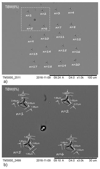 According to the adopted methodology (present in Section 2.1), 20 indentations were made for each coating with the selected indenter load (P), i.e., for the coatings: TiB2, Ti-B-W (3%), Ti-B-W (6%) was P = 200 mN, while for the coating Ti-B-W (10%) was P = 400 mN. The penetration depth was respectively h200mN = 1000 nm and h400mN = 1600 nm. For each indention, we measured the edge lengths for the indentation an and the crack lengths ln1, ln2, ln3, where n is the number of indentation. For each indentation, we determined the average values of ln according with equation ln = (ln1 + ln2 + ln3)/3. Then, for each tested coating, the average values of l and a were determined for the whole series of 20 indentations in accordance with relation Equations (2) and (3). Figure 5a,b shows an example of series of indentations made for the Ti-B-W (6%) coating and the results of the indentation n = 1.