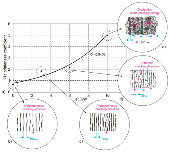In the article, the authors presented how the changes in the fracture toughness KIC for TiB2 and Ti-B-W coatings depend on the atomic % tungsten concentration (at.% W), as shown in Figure 6a. Observations of the brittle fracture cross-section showed that the TiB2 coating has a column structure, where the grain diameter is ≈100 nm (Figure 3a). The brittle fracture cross-section in the TiB2 coating has a clear intergranular character. In Figure 6b, the authors presented a scheme of the microstructure of the TiB2 coating, where the direction of cracking is parallel to the direction of growth of pillar grains (perpendicular to the surface of the coating). The presented diagram explains the high brittleness of the TiB2 coating and the low value of the fracture toughness KIC (KIC [TiB2] = 0.67).