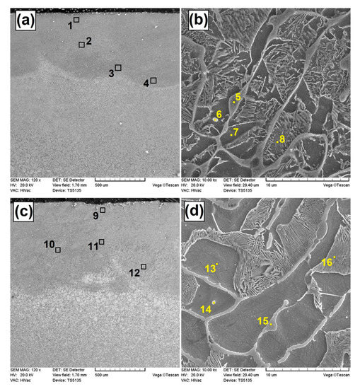 Table 3 shows the results of Energy Dispersive X-ray Spectroscopy (EDS) tests for the points marked on the microstructure images (Figure 4 and Figure 5). An increased content of boron was found in the upper and middle zones of the laser tracks in the Fe–B coating. The areas with a dendritic microstructure had a slightly increased boron content (Figure 4b, item 5) as opposed to the matrix (Figure 4b, item 7). Increasing the laser beam power during the remelting process caused a reduction in the boron content (Figure 4a point 1 in Table 3, and Figure 4c point 9 in Table 3). In the case of Fe–B–B4C–Si coatings, the percentage content of boron was also increased in the upper and middle zones of the laser track. The amount of boron increased with the decreasing laser beam power as well as with decreasing scanning speed.