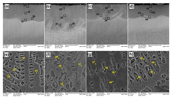 Microstructure of Fe–B–B4C–Si coatings: (a) laser tracks of #3; (b) laser tracks of specimen #4; (c) laser tracks of specimen #5; (d) laser tracks of specimen #6; (e) remelted zone of specimen #3; (f) remelted zone of specimen #4; (g) remelted zone of specimen #5; (h) remelted zone of specimen #6 (specimens numbers in accordance with Table 2).