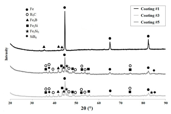 X-ray diffraction of Fe–B and Fe–B–B4C–Si composite coatings (specimen numbers in accordance with Table 2).