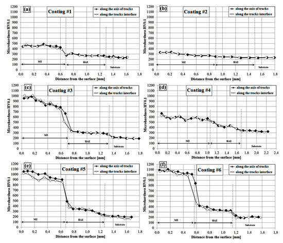 Microhardness profiles of C45 steel with Fe–B and Fe–B–B4C–Si composite coatings obtained by laser cladding technology using different laser parameters: (a) coating #1; (b) coating #2; (c) coating #3; (d) coating #4; (e) coating #5; (f) coating #6. (specimen numbers in accordance with Table 2).