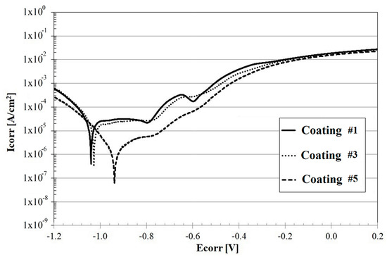 The results of the corrosion resistance tests are shown in Figure 8. The current density curves as a function of predetermined potential are presented. The values of the electrochemical parameters were designated based on the analysis of the curves, and are shown in Table 4.