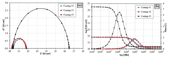 Electrochemical impedance spectroscopy diagrams are presented in Figure 9. The amplitude-phase characteristic in the form of Niquist plots is semicircular (Figure 9a). The larger diameter of the semicircle indicates a higher electric current resistance at the interface between the coating and solution. This proves the highest corrosion resistance of coating #5. The smallest diameter of the semicircle indicates the lowest corrosion resistance (coating #1).