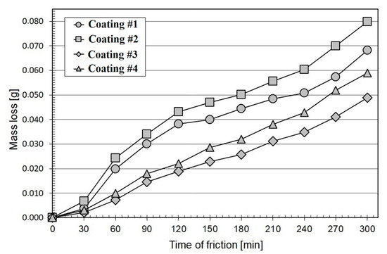 To carry out wear resistance tests an Amsler-type device was applied. In this method, flat specimens with produced coatings have contact with the ring counter-specimen of the tool steel under conditions of dry friction. In this study the counter-specimens were vacuum hardened (>60 HRC). Wear resistance studies were performed using the following parameters: rotation speed of counter-specimen 250 rev./min, load 147 N and duration of friction time 300 min. The contact areas between specimens and counter-specimens were cooled using compressed air at a pressure of 2 bar. A reciprocating compressor equipped with an air preparation system, which prevented the introduction of water drops into the friction area, was used for this purpose. Water is usually found in pneumatic conduits and this could change friction conditions. The mass loss of coatings was measured using the ALJ5004A analytical weight (KERN, Balingen, Germany) with a detection limit of 0.0001 g after every 30 min of friction.