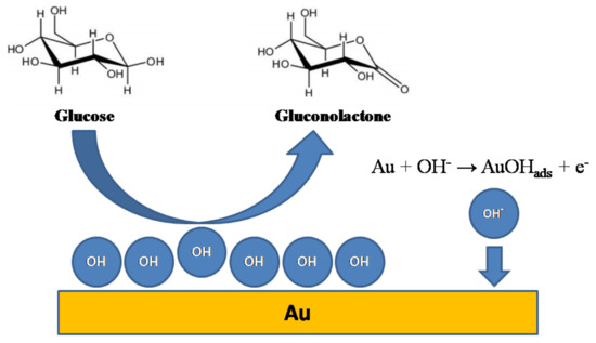 Regarding the processes occurring at the noble metal surface when the glucose molecule is approaching it, two particular mechanisms of oxidation are known. The first is called the chemisorption model. At moderately low potentials (i.e., −0.2 V vs. the reversible hydrogen electrode (RHE)) glucose molecules are adsorbed onto the gold surface in such a geometry that hemiacetal hydrogen is very close to the active metal sites. This hydrogen atom is then prone to be abstracted and simultaneous electron transfer (oxidation) occurs. Finally, an adsorbed intermediate is further oxidized to gluconolactone or similar compounds, which is a step that can occur across a very wide range of potentials, i.e., from +0.4 to +0.8 V vs. RHE. At even higher anodic potentials, the gold surface is oxidized, resulting in the formation of gold oxides (III). Glucose can also be oxidized onto the surface of such a layer and the whole process is under diffusion control. In general, the chemisorption model is stereoselective, and β-glucopyranose is more likely to be chemisorbed and then oxidized [1,7]. The abovementioned processes can be described by two equations: