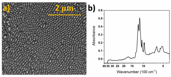 After the thermal dewetting of the thin gold films deposited onto the titanium dimpled template, regular arrays of gold nanoparticles embedded in semispherical hosting wells are obtained (Figure 2a). The size of the nanoparticles was 85 ± 10 nm and they had mostly circular shapes. The influence of various parameters on the morphology has been already discussed in detail in our previous works [21,22], and here we will not focus deeply on the surface analysis. This TiND|AuNP electrode was formed as a result of the optimized fabrication route. The FT-IR spectrum of the TiND|AuNP electrode covered with Nafion is presented in Figure 2b. One can easily see the characteristic absorption bands confirming the proper formation of the polymer coating over the metallic surface. They are in agreement with other studies of Nafion coatings [27,28], and the identified bands are collected in Table 1.