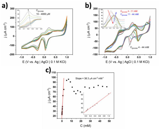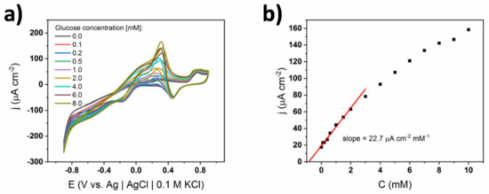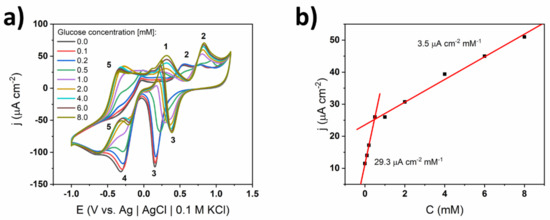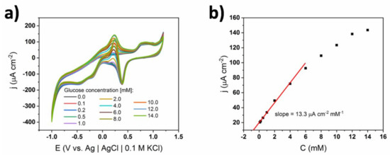 Finally, the influence of the ionic conductivity of the supporting electrolyte on the shape of the CV curves and the resulting calibration curves were evaluated. The cyclic voltammograms for a non-coated electrode immersed in 0.1 M concentrated sPBS are shown in Figure 12. All characteristic oxidation peaks can be distinguished, similarly to the 0.01 M concentrated solution (see Figure 4), while the position of the oxidation maxima was preserved upon the successive introduction of glucose into the electrolyte loading. However, the current density values corresponding to glucose oxidation were ca. 2 times smaller and in consequence the slope of the calibration curve decreased. Specifically, the slope equaled 5.5 μA cm−2 mM−1 for 0.1 M sPBS compared to 22.7 μA cm−2 mM−1 for 0.01 M. Thus, it can be stated that the increase of phosphates in the solution led to a decrease of electrochemical activity towards glucose. Such behavior was probably induced by the adsorption of phosphates on the gold surface, as has already been reported [41,42]. However, adsorption kinetics are slower for phosphates, compared to chlorides, and the reduction of catalytic activity is therefore smaller [42]. Although the sensitivity decreased, the adsorption of phosphates did not alter the glucose oxidation mechanism. Additionally, the second linear range was very wide (i.e., 2–20 mM), indicating the stability of the material in the presence of highly concentrated buffer. In contrast, no stability could be achieved in the case of 1 X cPBS containing large amount of chlorides.