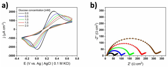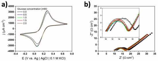 To investigate the differences between the material’s performance in two electrolytes, EIS experiments in the presence of a ferrocyanide redox pair (Figure 5) were performed. In order to obtain spectra of good quality, the concentrations of both the commercial and self-made phosphate buffers were increased 10-fold to 1 M, providing higher ionic conductivity of the solution. In this type of measurement, ferrocyanides can be treated as probe electroactive molecules that allow the surface states to be investigated [32]. One can see that after injecting the first portion of glucose, both oxidation and reduction peaks increased slightly and maintained their position and current density values for larger glucose concentrations. The peaks were symmetric in size and shape, and difference between the oxidation and reduction signals was 150 mV. Besides the relatively large value of this potential gap, the ferrocyanide redox reaction can be treated as reversible.