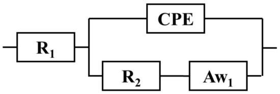 Randles equivalent circuit. R1 is solution resistance, R2—charge transfer resistance, and Aw1—Warburg semi-infinite linear diffusion element.