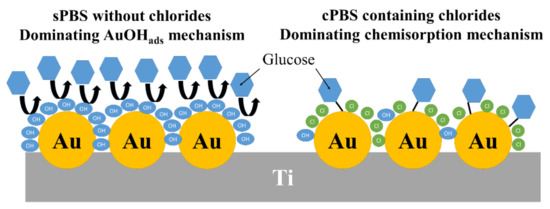 Summarizing the section dedicated to the investigation of nature of the calibration curve, the switching from the IHOAM to the chemisorption model as the dominating mechanism of glucose oxidation occurred when the concentration of glucose exceeded 0.5 mM. This transition was caused by chloride ions present in the commercial phosphate buffer, which adsorbed on the surface of the gold, reducing the number of AuOHads catalytic sites playing an important role in glucose oxidation. It is schematically presented in Figure 8.