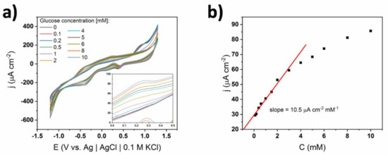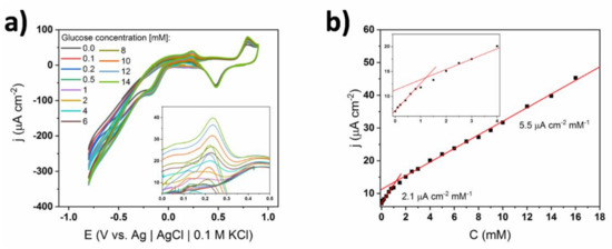 The CV curves for membrane-coated TiND|AuNP electrodes registered in different glucose concentrations along with the calibration curve are shown in Figure 9. In the range of the lower concentrations, i.e., 10–1000 μM, a glucose oxidation peak at +0.2 V was present similarly to the electrode without the Nafion coating. After exceeding 2 mM of glucose, a hydrogen abstraction peak at −0.4 V emerged, however it was relatively lower for the membrane-coated electrode. Interestingly, the main oxidation peak at +0.2 V increased with the concentration until 4 mM of glucose was reached. Then, the current density rapidly dropped and after exceeding 15 mM, it again rose. In contrast to the bare electrode, its potential gradually shifted from +0.2 to +0.35 V, while the glucose content was increasing in the range of 4–15 mM. It can be postulated that besides the transition between mechanisms, another effect played important role, namely the transfer of analyte through the channels in the structure was hampered as its concentration increased [36]. Moreover, a diffusion-controlled oxidation peak at +0.9 V appeared at a relatively large concentration of glucose (11 mM), while gold oxide reduction was also anodically shifted, and therefore, another glucose oxidation peak was emerging. The variety of observed changes in the electrochemical activity (i.e., potential shifts at higher concentrations) supports the statement that Nafion minimizes the effects related to the switching of the glucose oxidation mechanism.