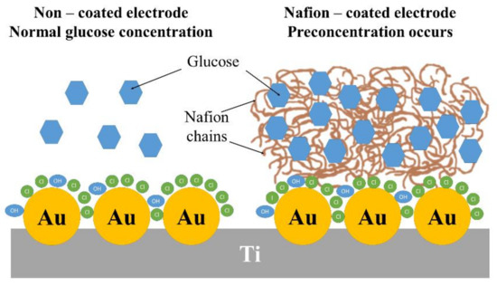 Taking into account the gathered results, when the permeable membrane protects the TiND|AuNP platform, it can be stated that Nafion increases the sensitivity and widens the linear range owing to the preconcentration effect. This phenomenon makes the transition between mechanisms more smooth, compared to the bare electrode conditions. Due to bottleneck effect, when the glucose exceeds 4 mM, the oxidation current drops, along with changes to the chemisorption model. The effect of the Nafion coating on the concentration of glucose is schematically presented in Figure 11.