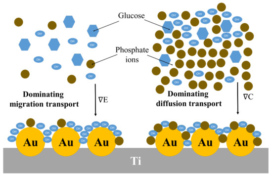 The set of sensing parameters determined for all examined conditions, including the electrode material and the buffer composition, is given in Table 4. Analyzing the values provided in the right column, it can be clearly seen that Nafion coating supports a widening of the linear range of electrochemical response regardless of the used liquid environment. This is connected with the abovementioned fact that, when Nafion is present on the surface, the apparent diffusion constant is smaller than for the bare electrode. Finally, it should be highlighted here that if the concentration of the supporting electrolyte and glucose are comparable, migration plays a significant role in the mass transport of hydroxyl ions. This is schematically presented in Figure 14.
