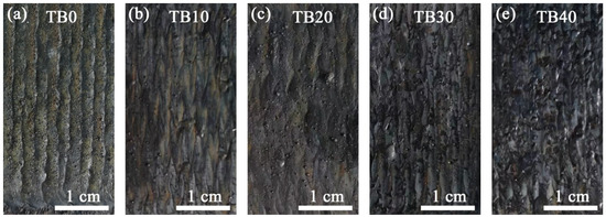 Figure 3 shows the surface morphologies of coatings with different TiB2 particles content. When the content of TiB2 particles is 0 wt.%, the TB0 coating presents a continuous, uniform and smooth surface morphology, without the macro-defects such as cracks, holes and spheroidization, and the lap interface between single tracks is quite good (Figure 3a). When the TiB2 particles were added into coatings, the composite coatings show darker surface morphologies for the presence of dark gray TiB2 particles, and they become darker as there is an increase in the content of TiB2 particles. Besides, at the same laser parameters, the laser energy absorbed by the Inconel 718 alloy inside coatings decreases as there is an increase in the content of TiB2 particles, resulting in the poor continuity, large roughness and weak lap interface on the surface of the composite coatings. When the content of TiB2 particles is between 10 and 30 wt.%, the surface of the composite coatings is relatively flat, with only a few defects such as spheroidization and pits (Figure 3b–d). However, when the content of TiB2 particles is 40 wt.%, more unmelted particles exist in the molten pool, which cause the increase in the huge surface tension of the liquid phase during solidification, so the surface of the TB40 coating displays serious spheroidization and large roughness (Figure 3e).