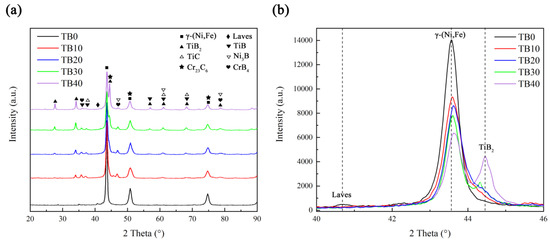 Figure 5a shows the X-ray diffraction (XRD) patterns of coatings with different TiB2 particles content. It can be seen that when there are no TiB2 particles in the coating, the phases in the TB0 coating mainly include γ-(Ni, Fe), Cr23C6 and Laves, where γ-(Ni, Fe) is the matrix phase and Laves is the harmful non-equilibrium phase for it consumes Nb, Mo and other alloy elements which are beneficial to γ-(Ni, Fe). When the TiB2 particles are added into the coating, it is inevitable for TiB2 particles to partially melt for the effect of the high-energy laser beam, so the elements Ti and B will be released into the molten pool, which is conducive to the generation of TiB, TiC, Ni3B and CrB4. It can be found from Figure 5b that the diffraction peak of γ-(Ni, Fe) decreases as the TiB2 particles content increases from 0 to 40 wt.%, and it also accompanies the increase in the diffraction peak of TiB2, which is obviously caused by the content change of the Inconel 718 alloy and TiB2 particles. In addition, it is worth noting that the diffraction peak of the Laves phase in the TB0 coating is higher than that of the TB10, TB20, TB30 and TB40 coatings, indicating that the addition of TiB2 particles helps to reduce the precipitation of the Laves phase.