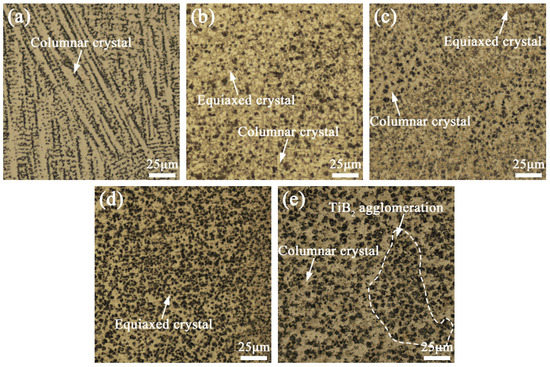 Figure 6 shows the OM images of the cross-section microstructure of coatings with different TiB2 particles. It can be found that the microstructure of coating TB0 is mainly columnar crystal (Figure 6a), and when the TiB2 particles are added, the solute concentration gradient and temperature gradient at the front of the solid–liquid interface are increased compared to the coating TB0, leading to the increase in the crystallization temperature range and constitutional undercooling degree of γ-(Ni, Fe), which helps the transformation of columnar crystals to equiaxed crystals [25]. Hence, there are equiaxed crystals with good isotropic properties in coatings TB10–TB40 (Figure 6b–e). Moreover, as the content of TiB2 particles increases from 10 to 40 wt.%, it can be seen that the number of TiB2 particles increases and the size of TiB2 particles becomes larger, and the TiB2 particle agglomeration can be observed in coating TB40, which is explained in detail in the next section. In addition, compared with coating TB0, coatings TB10–TB40 show more dendrite boundaries and a smaller dendrite size, indicating that TiB2 particles have the effect of dendrite refining strengthening. From the perspective of solidification thermodynamics, there are two types of reasons for the fine dendrite strengthening: First, the ceramic particles can be fully wetted by the liquid phase, so the nucleation rate of dendrites will increase for the heterogeneous nucleation of ceramic particles, which causes the insufficient growth of dendrites and the dendrite refinement; second, the wetting property between the ceramic particles and the liquid phase is too poor to form effective heterogeneous nucleation, so the movement of the solid–liquid interface will be hindered by ceramic particles, which leads to the inhibiting effect for dendrites growth and can also play the role of dendrite refinement.