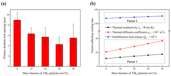 The calculated cooling rate influence factors are as shown in Figure 7b. As the content of TiB2 particles increases from 10 to 40 wt.%, , and increase from 13.05 W/(m·K), 24.73 × 10−7 m2/s and 148.41 × 106 J to 17.55 W/(m·K), 36.67 × 10−7 m2/s and 150.87 × 106 J. When the content of TiB2 particles is at a low level (10 and 20 wt.%), factor 1 plays a dominant role in decreasing the PDAS, indicating the increase in TiB2 particles content is conducive to the increase in the thermal conductivity and thermal diffusion coefficient of the coating, which can effectively reduce the solidification time and increase the cooling rate. When the content of TiB2 particles increases to 30 wt.%, the PDAS will still decrease for the positive effect of factor 1, but the trend of decrease is slower than that of a low TiB2 particles content, which can be related to the negative effect of factor 2 for the heat released during solidification is up to 150.05 × 106 J. However, the PDAS increases when the TiB2 particles content increases to 40 wt.%, indicating factor 2 has taken the dominant role in influencing the cooling rate, of which the heat released during solidification further increases to 150.87 × 106 J.