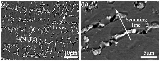 Figure 8a shows the SEM image of the microstructure of coating TB0. It can be observed that coating TB0 contains the gray matrix phases and white precipitate phases which are distributed in chains at the dendrite gaps. Figure 8b is the high magnification of the microstructure of coating TB0; the EDS line scan was carried out on the white precipitate phases, and the results are shown in Figure 8e. It can be found that Nb and Mo are segregated toward the dendrite boundary areas and highly enriched in white precipitate phases, and Ni, Fe and Cr are segregated to the gray matrix phases and relatively depleted in white precipitated phases. The EDS analysis was carried out on white precipitate phase and gray matrix phase, and the results are as shown in Figure 8f,g. It displays that the content of Nb and Mo in the white precipitated phase is as high as 22.31 and 7.39 wt.%, which is higher than that of the gray matrix phase of 2.92 and 1.74 wt.%, while the content of Ni, Fe and Cr in the white precipitated phase is 42.36, 10.24 and 9.57 wt.%, respectively, which is lower than that of the gray matrix phase. For elements such as Nb and Mo with the solute partition coefficient of less than 1, their content in the liquid phase is higher than that in the solid phase, they will gradually enrich at the dendrite boundaries as the solidification process progresses and at the end of solidification, the eutectic reaction of L → γ + Laves occurs, leading to the precipitation of the Laves phase enriched in elements such as Nb and Mo [35]. Therefore, the white precipitated phases and the dark grey area should be Laves phases and γ-(Ni, Fe) phases, respectively. Since the Laves phase consumes a large amount of alloying elements that are beneficial to γ-(Ni, Fe), it has high hardness and brittleness, and it also is prone to become the place where crack initiation and expansion occur, which seriously affects the mechanical properties of coating TB0.