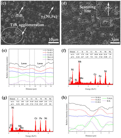 Figure 8c shows the SEM image of the microstructure of coating TB10. Compared with coating TB0, due to the addition of TiB2 particles, the constitutional undercooling and cooling rate of coating TB10 increases, so the microstructure is mainly equiaxed crystals and the dendrite size is significantly decreased, and the Laves phases are hardly observed along the dendrite boundaries. For the increase in the cooling rate, the dendrite spacing decreases, and the narrow dendrite boundaries are not conducive to the segregation of the Laves phase, resulting in the decrease in the segregation rate of elements such as Nb and Mo. At the same time, due to the reduction in the alloy element diffusion coefficient affected by the increase in the cooling rate, Nb, Mo and other elements are difficult to diffuse from the dendrite to the dendrite boundary at the end of solidification, resulting in the Laves phase not being able to be supplemented by elements, which is not conducive to its growth at the dendrite boundary [36,37]. In addition, it can also be seen that there is a rich area of dark gray particles in coating TB10, and the dark gray particles are mainly distributed along the dendrite boundaries from Figure 8d. The EDS line scan is carried out on the dark gray particle (Figure 8h), and the results show that Ti and B are highly enriched in the particle where Ni, Fe and Cr are relatively depleted, indicating the dark gray particle is a TiB2 particle.