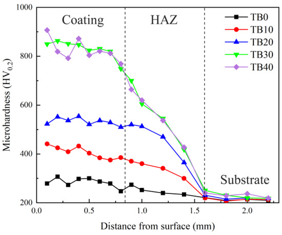 Figure 10 displays the microhardness distributions of coatings with different TiB2 particles contents. Due to the existence of TiB2 particles with high hardness and elastic modulus, there are stress field and lattice distortion at the interface between the Inconel 718 alloy matrix and TiB2 particles, which can effectively hinder the dislocation slippage and improve the microhardness macroscopically. Therefore, coatings TB10–TB40 show higher microhardness than that of the substrate and coating TB0. Besides, the density of TiB2 particles (4.52 g/cm3) is less than that of Inconel 718 alloy (8.24 g/cm3), so the TiB2 particles are prone to be present at the top of the coating, resulting in the microhardness at the top being higher than that at the middle and bottom. In addition, for the dilution effect, there is a certain content of γ-(Ni, Fe) solid solution in the heat-affected zone which has experienced rapid thermal quenching during the laser cladding, so the microhardness of the heat-affected zone is between that of the coating and the substrate.