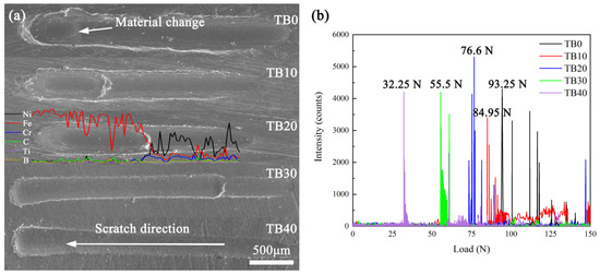 As the load applied by the scratch tester on the coating through the diamond indenter gradually increases, the degree of plastic deformation increases, resulting in the scratches becoming wider and deeper, which is shown in Figure 11a. We measured the average width of the scratch of each coating, and the results are shown in Table 5. It can be found that as the TiB2 particles content increases from 0 to 40 wt.%, the scratch width experiences a process of decreasing from 365.89 to 287.21 μm and then increasing to 300.87 μm, and it reaches the minimum value when the TiB2 particles content is 30 wt.%. The reason for the above change can be related to the microhardness at the bottom of the coating, which means the greater the microhardness at the bottom of the coating, the stronger the ability to resist plastic deformation, and the smaller the scratch width. The bottom microhardness of coatings TB0–TB40 is 252, 360, 513, 820 and 812 HV0.2, and it is obvious that the bottom microhardness of coatings TB30 and TB40 is relatively high, which leads to the small scratch width. From the acoustic emission signal diagram (Figure 11b), it can be seen that the acoustic emission signals of coatings all change suddenly under a certain load, which can be attributed to the change in the material to which the diamond head is in contact (Figure 11a), then the scratcher will detect a continuous and strong acoustic emission signal, and the load causing this phenomenon can be defined as the critical bonding load. According to the ASTM G171-03 norm, the bonding strength can be calculated by the following formula [40]: