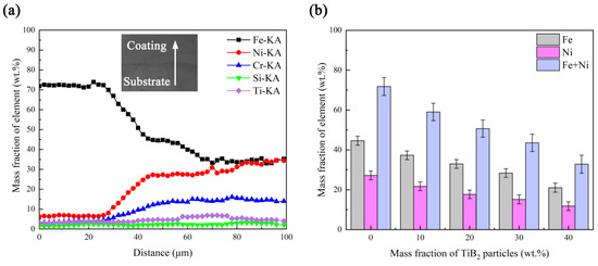 Table 5 displays the results of the scratch test of coatings with different TiB2 particles content. It can be seen that the bonding strength decreases from 1.785 to 0.908 GPa as the TiB2 particles content increases from 0 to 40 wt.%, which is similar to the effect of the TiB2 particles content on the dilution rate in the above analysis. Figure 12a is the element distribution of coating TB0 near the coating/substrate interface, where it can be found that Ni, Fe and Cr are the dominant elements at the bottom of coating TB0, and Fe is the dominant element in the substrate. As the scanning line crosses the interface, a notable content decrease in Ni, Fe and Cr and a notable content increase in Fe can be observed for the dilution. Since the solid solution strengthening which is caused by γ-(Ni, Fe) plays an important role in the bonding at the interface, the high content of γ-(Ni, Fe) is conducive to the increase in bonding strength. From the Ni and Fe content of coatings near the coating/substrate interface, it can be seen that as the TiB2 particles content increases from 0 to 40 wt.%, the content of Fe and Ni changes from 44.61 and 27.21 to 21.04 and 11.78 wt.% for the decrease in the dilution rate, and the decrease in their contents sum from 71.82 to 32.82 wt.% can also be observed. According to the Ni-Fe binary phase diagram, the solubility of Fe in γ-Ni is infinite [41], so the γ-(Ni, Fe) content will decrease with the increase in the TiB2 particles content, which is not conducive to the solid solution strengthening near the interface and harmful to the bonding strength. In addition, the good metallurgical bonding cannot be guaranteed in coating TB40 for the obvious cracks at the interface, which also helps the decrease in the bonding strength of coating TB40.