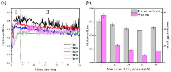 Figure 13a is the friction coefficient curves of coatings with different TiB2 particles contents. It can be observed that all friction coefficients of coatings TB0–TB40 have undergone two stages of change, namely the running-in stage (Figure 13a-I) and the stable stage (Figure 13b-II). Due to the low surface microhardness of coating TB0, where the wear occurs quickly under the grinding ball, the running-in stage ends within only 0.8 s, and the friction coefficient in the stable stage fluctuates very sharply for the poor ability to coordinate the dislocation of coating TB0 with a coarse microstructure. For the existence of TiB2 particles, coatings TB10–TB40 show longer running-in stages, which are 1.6, 1.5, 2.6 and 2.9 min, respectively, and the friction coefficient in the stable stage tends to change steadily when the TiB2 particles content increases from 10 to 30 wt.%, which can be attributed to the finer and denser microstructure and more homogeneous distribution of TiB2 particles. However, when the TiB2 particles content increases to 40 wt.%, the non-uniform distribution of TiB2 particles leads to the poor uniformity of the microstructure, resulting in the significant fluctuations in the friction coefficient during the stable stage. Figure 13b shows the friction coefficients and wear rates of coatings with different TiB2 particles contents. As the TiB2 particles content increases from 0 to 30 wt.%, the friction coefficient and wear rate decrease from 0.461 and 5.65 × 10−6 g/(N·m) to 0.355 and 9.12 × 10−7 g/(N·m), but they increase to 0.389 and 1.39 × 10−6 g/(N·m) instead as the TiB2 particles content continues to increase to 40 wt.%.