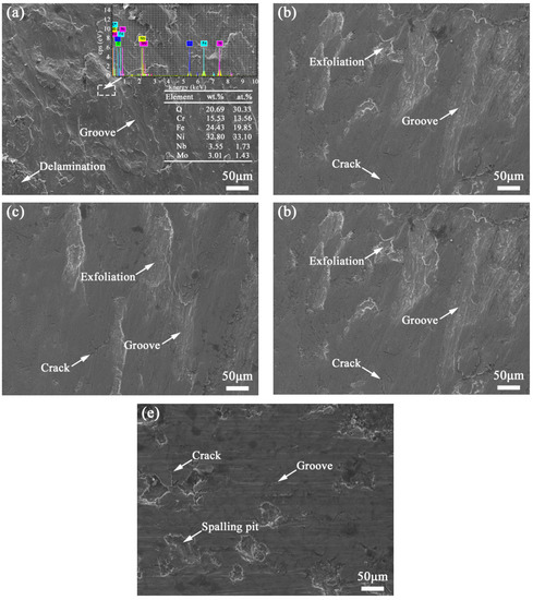 When the TiB2 particles content is increased to 30 wt.%, the microhardness of coating TB30 is further improved, and the uniform distribution of TiB2 particles helps to form wear-resistant fulcrums, which effectively resist the micro-cutting effect of GCr15 grinding balls. Besides, the uniform and dense dendrites in coating TB30 can effectively coordinate the alternating stress to prevent the nucleation and propagation of cracks, so there are almost no obvious plastic deformation, micro-tearing and layered structure on the worn surface, where only a few cracks exist (Figure 14d). The above phenomenon indicates the main wear mechanism of coating TB30 is micro-cutting wear, accompanied by abrasive wear. As the TiB2 particles content increases further, compared with coating TB30, the wear resistance of coating TB40 is reduced, and there are obvious peeling pits, cracks and furrows on the worn surface (Figure 14e). Although the surface of coating TB40 can effectively avoid plastic deformation for the high microhardness, due to the high hardness and brittleness of the region which is rich in TiB2 particles for the uneven distribution of TiB2 particles and the large residual stress in the weak bonding interface between the TiB2 particle and Inconel 718 matrix for the difference in the thermal expansion coefficients, the TiB2 particles are easily detached from coating TB40 during the friction process, aggravating wear and forming deep grooves. Therefore, micro-cutting is prone to occur on the worn surface, which leads to the formation of peeling pits. The wear mechanism of coating TB40 includes micro-brittle fracture wear and abrasive wear.