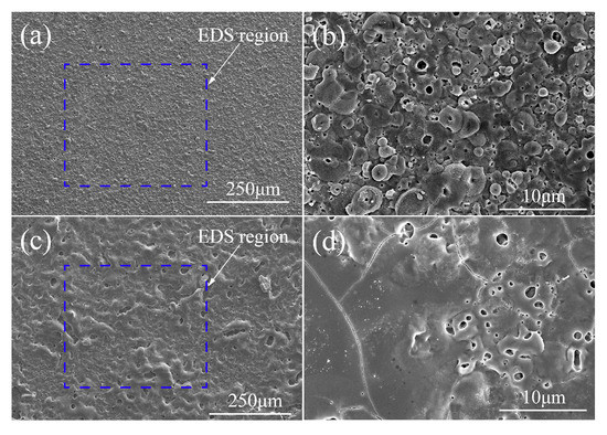 Figure 2 and Figure 3 show the surface morphology of the PEO sample of the AZ31 magnesium alloy in different electrolyte compositions. From the lower-magnification images in Figure 2 (Figure 2a,c), it can be seen that the surface of Al-coating and Si-coating is rough, and the roughness of Si-coating greatly corresponds to the fluctuations of the voltage–time curve. It can be seen from the high-magnification images of the samples in Figure 2 (Figure 2b,d) that the Al-coating surface is composed of many discharge holes and “pie-shaped” discharge products, and the formation of the products is due to the material erupting through the holes and cooling and accumulating around the discharge holes during the PEO process. There is a large number of holes and cracks on the surface of Si-coating, and the holes on the surface of Si-coating tend to accumulate at certain weak locations. The surface morphology of Al-coating and Si-coating are the typical morphologies of PEO samples.