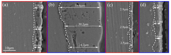 Figure 4 shows the cross-sectional morphology of the PEO sample of AZ31 magnesium alloy in different electrolytes. It can be seen that the cross-sectional morphology of the PEO samples in different electrolytes is clearly different, and the thickness is in the following order: Si-coating > Al-coating > F-coating > P-coating The thickness of the Si-coating layer is 4–5 times that of the Al-coating layer, and the thickness of the thinnest P-coating layer is 2.5–2.9 µm. The height of the voltage–time curve corresponds to the coating layer thickness: the greater the thickness, the greater the breakdown voltage required. For example, the largest and smallest Si-coating and P-coating thickness values, respectively, correspond to the highest and lowest voltage–time curves, respectively.