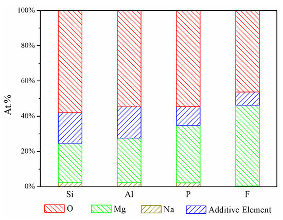 Figure 5 shows the atomic percentage contents of each element on the surface of the PEO sample in Figure 2a,c (low- and high-magnification images, respectively, of Al-coating and Si-coating) and Figure 3a,c (low- and high-magnification images, respectively, of P-coating and F-coating). It can be seen that the relative atomic percentage content of elements in the oxygen element and additives gradually decreases in the order of Si > Al > P > and F, while the relative atomic percentage content of the Mg element gradually increases. The relative atomic percentage content of the oxygen element and the additive element is relatively high, indicating that the additive anion in the electrolyte participates in the PEO reaction to form a ceramic layer at a high rate. An analysis of the anion atomic percentage content of each coating additive shows that the Si element in Si-coating has the highest relative atomic percentage content, indicating that SiO32− is most likely to participate in the PEO reaction. At the same time, the corresponding Si-coating voltage curve is higher, which indicates that SiO32− is more likely to participate in the formation of the ceramic layer. On the other hand, the F element has the lowest relative atomic percentage content in the F-coating, indicating that it is more difficult for F– to participate in the PEO reaction.