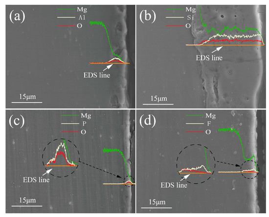 The EDS line-scan results in Figure 6 showed that the main elements in the coatings are additive element, magnesium and oxygen. It can be seen from Figure 6 that the concentration of additive elements gradually decreased from coatings towards the substrate in the inner layer, which is related to the gradually difficult of additive element to enter the substrate [23,24]. The aluminum and oxygen in the Al-coating are mainly distributed between the inner layer and the outer layer, which might be proved that the AlO2− ions participate in the reactions in the microarc discharge channel and enrich between the inner layer and the outer layer, corresponding to the cross-sectional morphology of Al-coating which exist more holes and cracks [25,26]. It can be seen from Figure 6b that the silicon content in the outer region is higher than that in the inner region of the coatings, the reason is that the formation of Si-containing insoluble gels will increase the migrating diffificulty of SiO32− towards the coating interior [27]. Figure 6c shows that the phosphorus and oxygen in the P-coating present a stepped distribution in the ceramic layer, that is, the content of phosphorus and oxygen between the inner layer and the outer layer is higher than the content in the inner layer, and the content of outer layer is lowest. The phenomenon of stepped distribution may related to the strong activity of phosphate and easier enter into the matrix [28,29,30]. Figure 6d shows that the fluorine in the F-coating is mainly distributed in the outer layer, while the oxygen is mainly distributed in the inner layer. The fluoride may mainly distributed in the outer layer of the sample, and the oxide may mainly distributed in the inner layer of the ceramic layer, respectively. The accumulation of the fluoride in the outer layer has a great effect on improving the corrosion resistance [31].