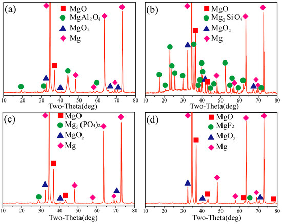 Figure 7 shows the XRD diffraction pattern of the PEO samples of each AZ31 magnesium alloy sample in different electrolytes. Comparing the Powder Diffraction File (PDF) card identified that the phases of the ceramic layers formed by different electrolytes are different, but they all contain MgO (file 77-2364, ICDD-PDF database) and MgO2 (file 76-1363, ICDD-PDF database) [32]. The formation of MgO and MgO2 is a result of the reaction between the magnesium alloy matrix and OH– in the electrolyte. The phases in the ceramic layers obtained by different electrolytes are MgAl2O4 (file 77-0438, ICDD-PDF database) in Al-coating, Mg2SiO4 (file 78-1372, ICDD-PDF database) in Si-coating, Mg3(PO4)2 (file 88-0413, ICDD-PDF database)in P-coating, MgF2 (file 41-1443, ICDD-PDF database) in F-coating. This is the result of the different effects of the anions contained in different electrolytes. In addition, it can also be seen that the peak intensity of the phases formed by the anion element contained in each additive in the PEO ceramic layer also differs. Further, in Si-coating (Figure 7b), the peak intensity of Mg2SiO4 is strong, which may be due to the large thickness of Si-coating; for the thinner Al-coating and F-coating, the peak intensity corresponding Mg3(PO4)2 and MgF2 are relatively weak, however, they are apparently detected. The relative peak intensity of the phase in the coating is related not only to the thickness of the coating but also to the activity of the components in the electrolyte involved in the PEO. The higher Mg2SiO4 peak intensity in Si-coating is related to the formation of the ceramic layer that facilitates the participation of SiO32−.